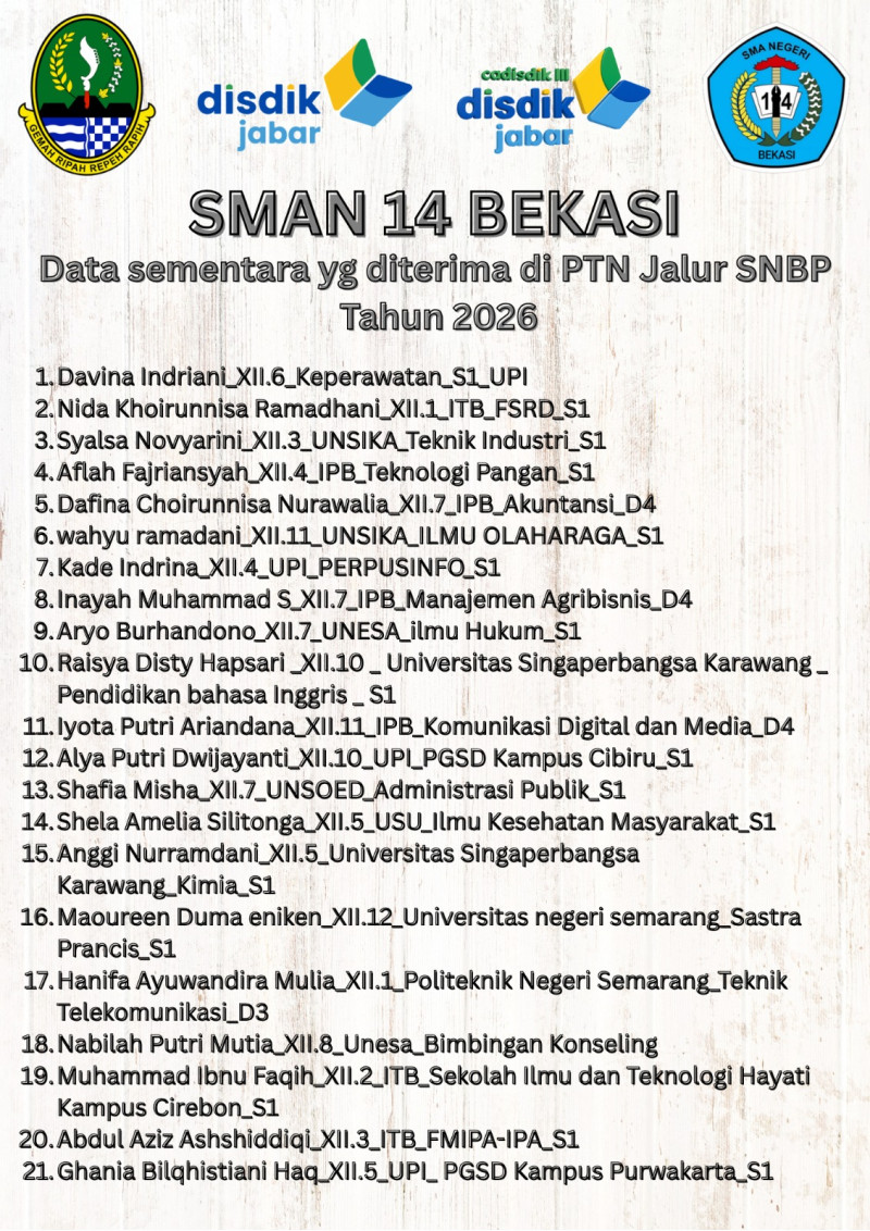 Selamat dan sukses kepada 21 Siswa SMAN 14 Bekasi Diterima di PTN Jalur SNBP :
