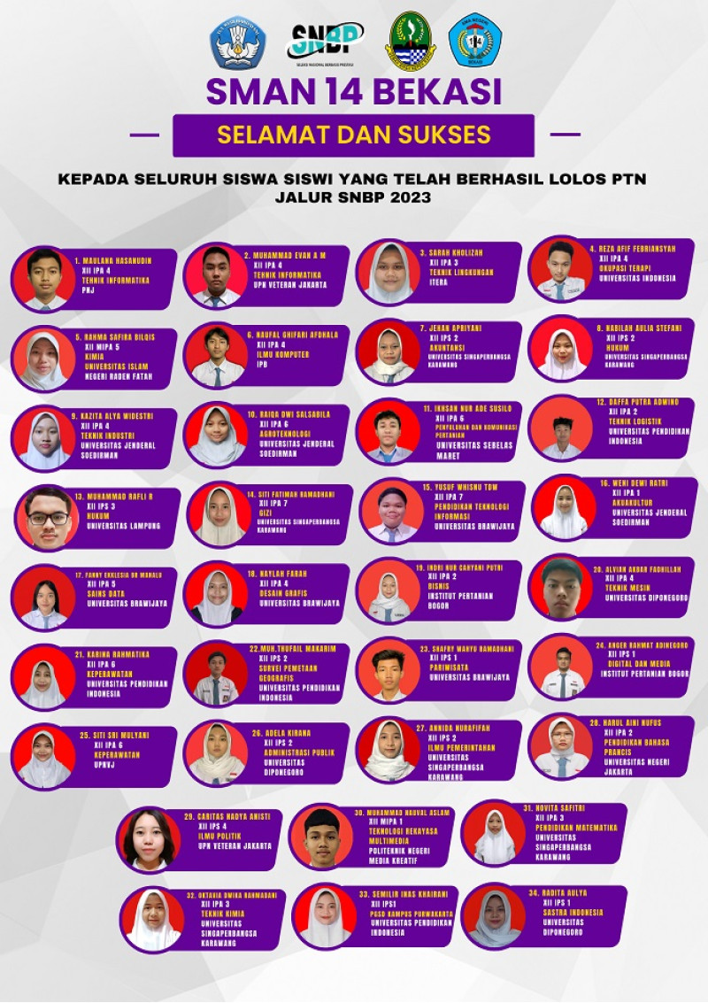 Alhamdulillah sebanyak 34 siswa SMAN 14 Bekasi berhasil lolo PTN melalui jalur SNBP 2023. Siswa yang lolo diantaranya yaitu :
